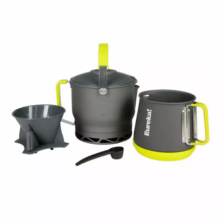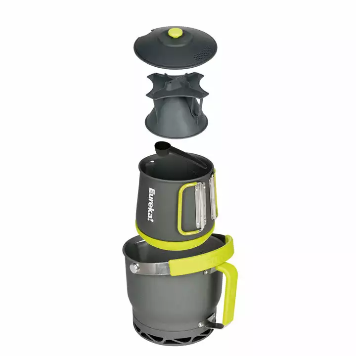 Nesting together for easy transport and storage, the Camp Cafe brews quality coffee for the whole crew quickly and cleans up in a snap. Equipped with Eureka!’s patented Flux Ring technology, the 2. 5-liter (80-ounce) boiling kettle boils water twice as fast as a standard kettle. Make quality coffee for the whole crew with the pour-over filter holder and 12-cup (60-ounce) coffee carafe.