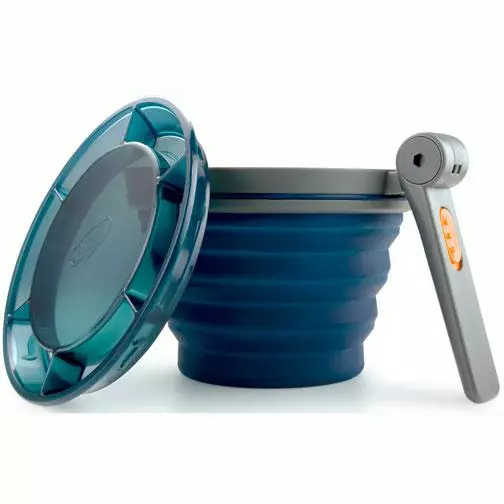 Collapsible bellows design collapses to 1.7 high disc. Folding handle folds flat or extends to lock in two positions for eating and drinking or for scooping and measuring. Sure-sealing lid made of Infinity Clear Polypropylene screws into the rim of the mug to keep your meals in and the outdoors out.