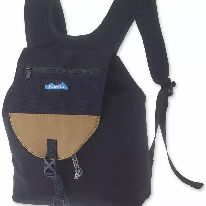 Rucksack with adjustable shoulder straps, main compartment with cord lock cinch and flap closure, one exterior zip pocket on flap, interior zip pocket, padded bottom and back panel with KAVU embroidery, synthetic suede accent on flap.