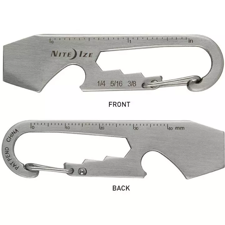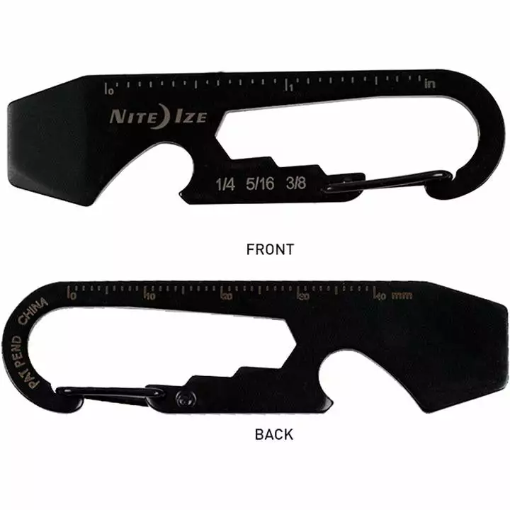 - Features the following tools: Box Cutter, Bottle Opener, Wrench (1/4″, 5/16″, and 3/8″), Ruler (inches and centimeters), and Flat Head Screw Driver