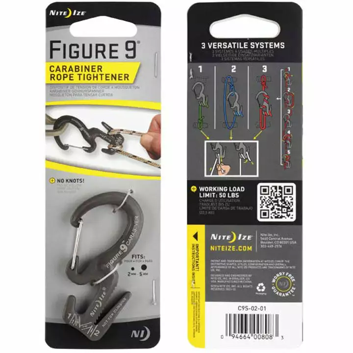 The Nite Ize Figure 9 Carabiner tightens, tensions, and secures ropes without knots. Whether tethering a canoe to your vehicle, anchoring boxes to a dolly, or bundling wood, this carabiner secures large loads quickly and keeps tension where you need it. Loop your rope through its strategically designed prongs, pull it tight, and it stays that way.