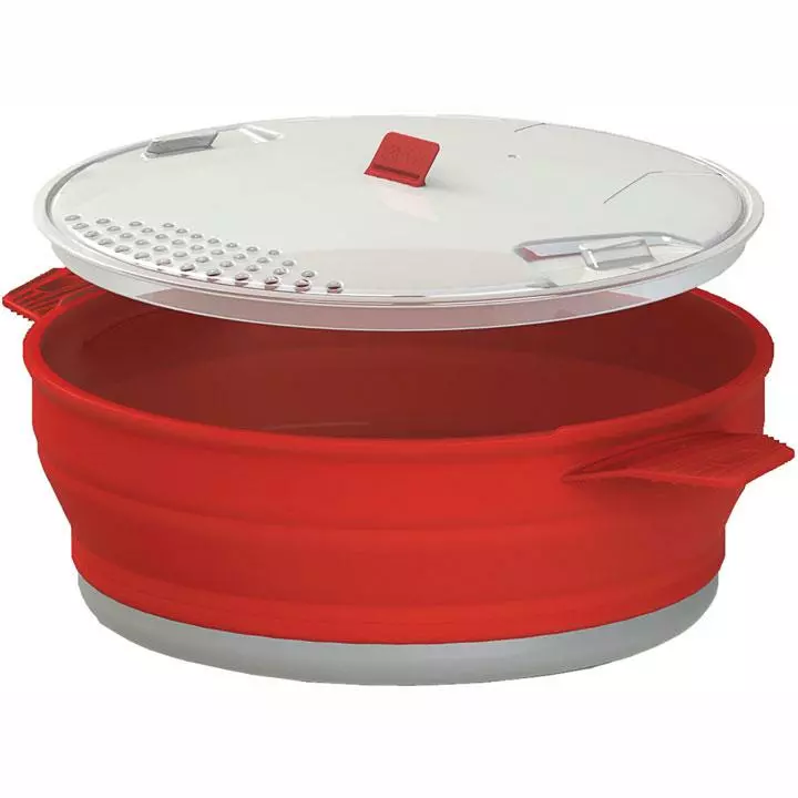 Until now, your camp cooking pot was the most bulky, awkward item in your kit. The Sea to Summit X-Pots change all that. The X-Pot is a fully featured cooking pot that combines the heat-distribution of aluminum with the flexibility of silicone. The hard anodized aluminum base offers a fast boil time and the stainless steel ring embedded in the rim lends a rigidity to the silicone walls for easy lifting and stirring. Top it off with a clear locking lid with an integrated strainer and you have a full-size pot that packs down to an inch tall disk. The added beauty of the X-Pots: Your X-Bowls and X-Mugs can nest inside for an exceptionally compact cook set.ÂÂ
